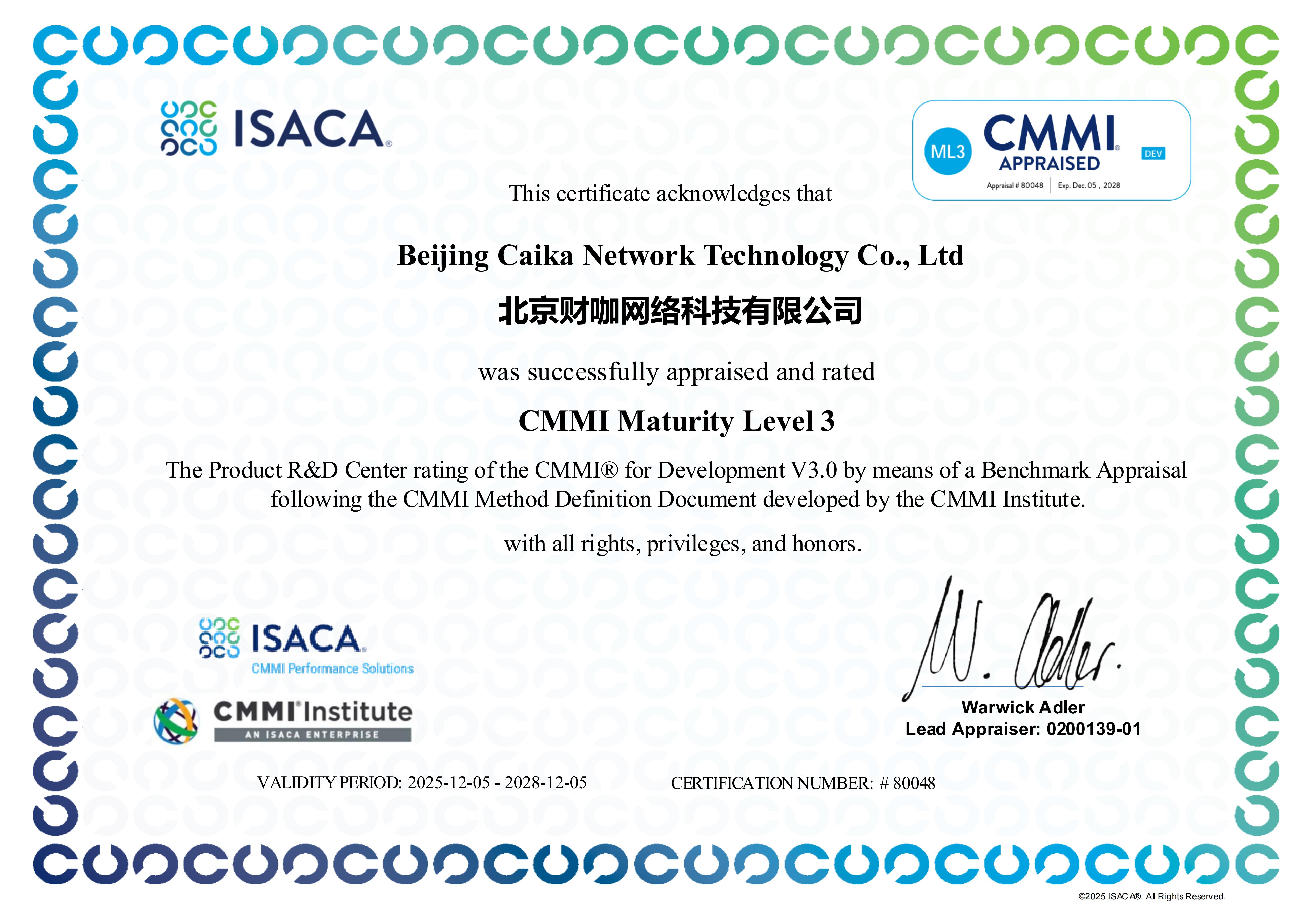 财咖自成立以来,始终将研发创新与质量管控置于核心战略地位,更坚守 “客户第一” 的核心价值观,将客户需求深度融入企业运营、研发管理与服务交付的全流程。为通过此次 CMMI3级认证,财咖组建专项推进小组,全面梳理企业研发体系,优化项目管理机制,强化质量保障流程,历经多轮严格的文档审核、现场评估与流程验证,最终凭借成熟的研发管理模式、规范的过程控制能力及优质的产品与服务交付质量,顺利通过认证评审。