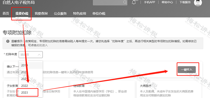 (1)进入【首页】,点击【我要办税】,选择【扣除年度2023】,然后选择【一键带入】。