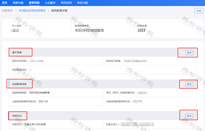 (3)点击【修改】,即可对该扣除项目进行相应的修改。值得一提的是,在电脑端的信息修改中,可以对“基本信息”和“申报方式”在同一界面一同修改。