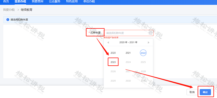 ◆打开“个人所得税”APP,注册并登录,选择【首页】→【专项附加扣除填报】→【子女教育】→【选择扣除年度2023】→【确认】;