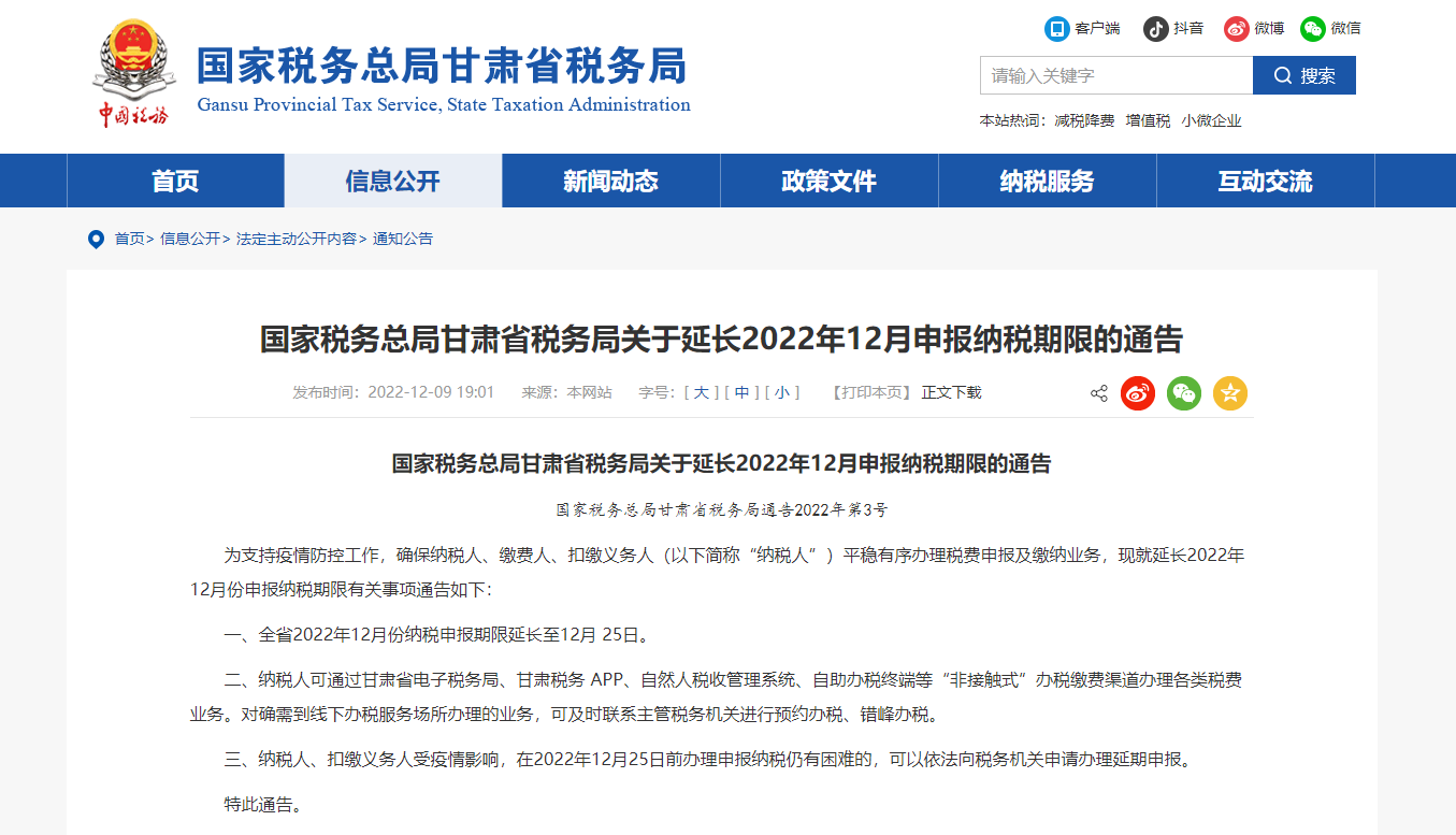 3、甘肃:12月份纳税申报期限延长至12月25日
