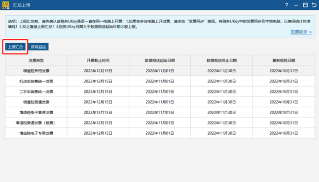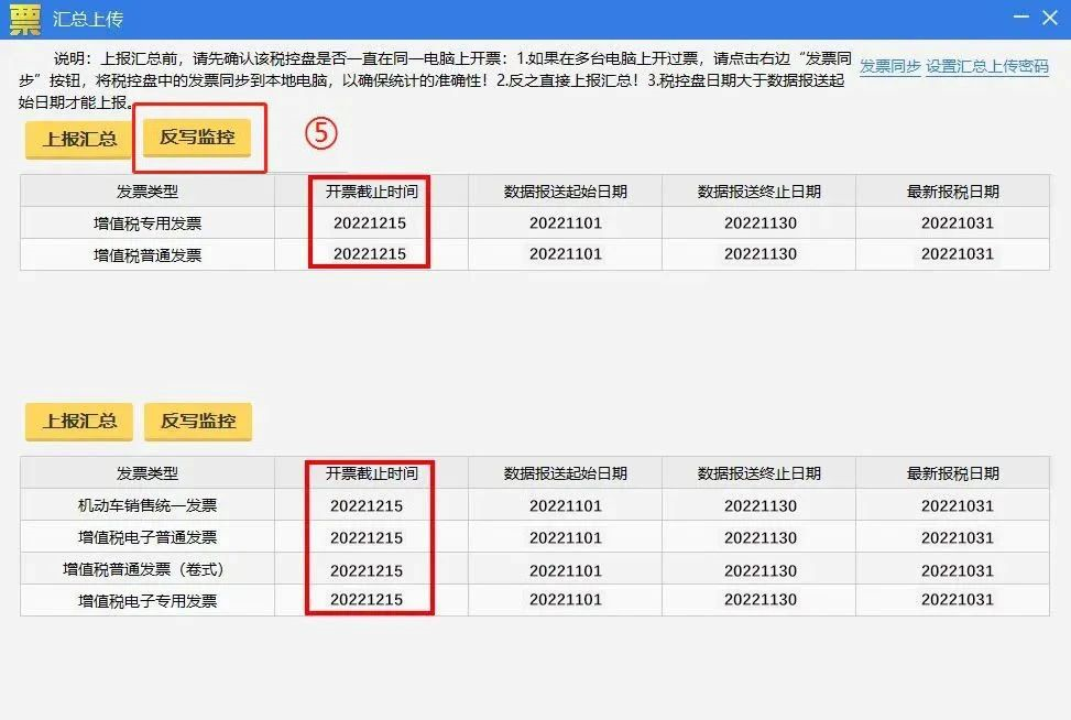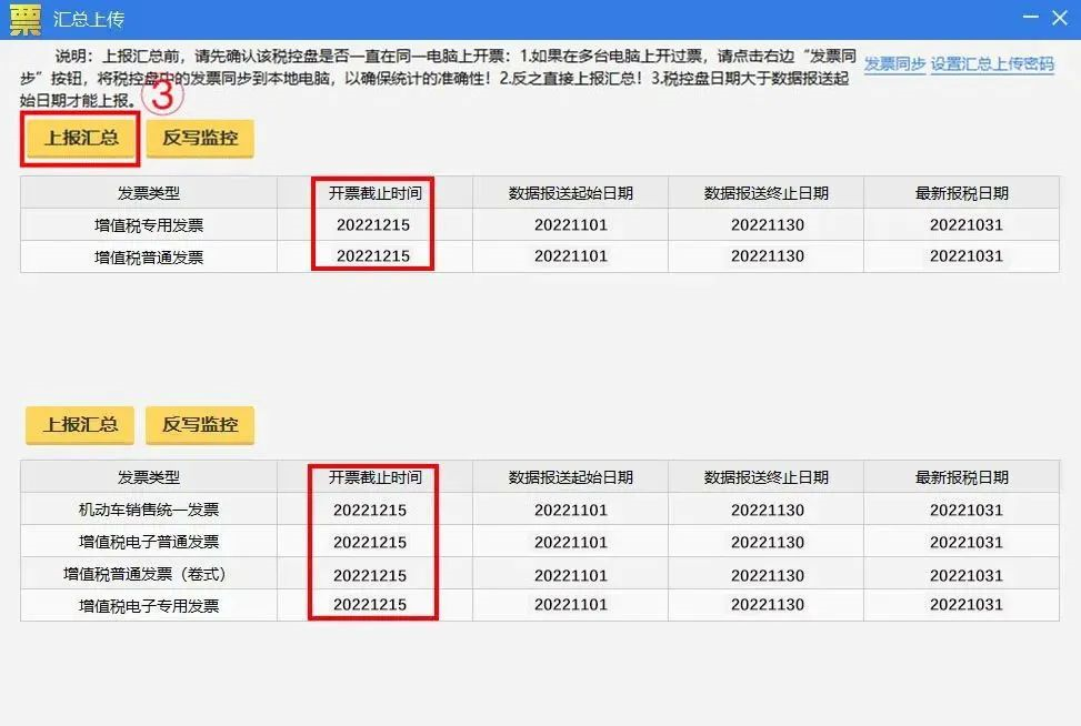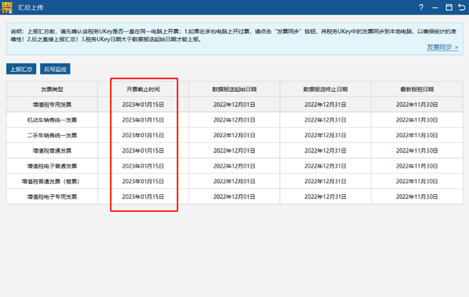 操作流程:重新打开汇总上传界面,查看各发票类型开票截止时间是否更新到下月中旬,若更新,说明操作成功。